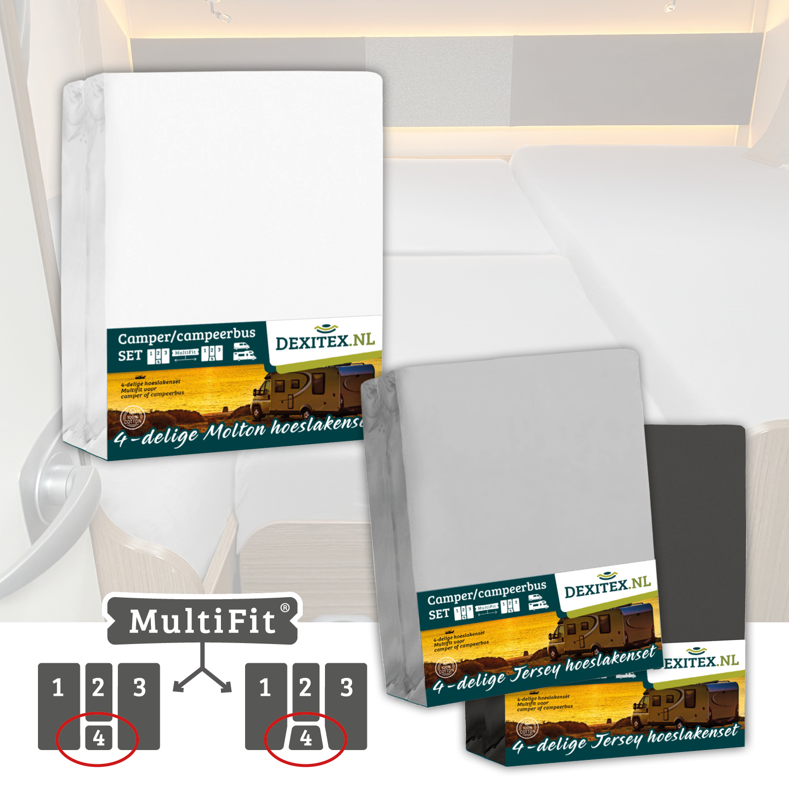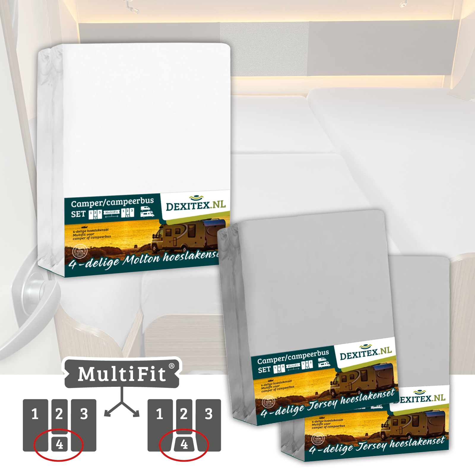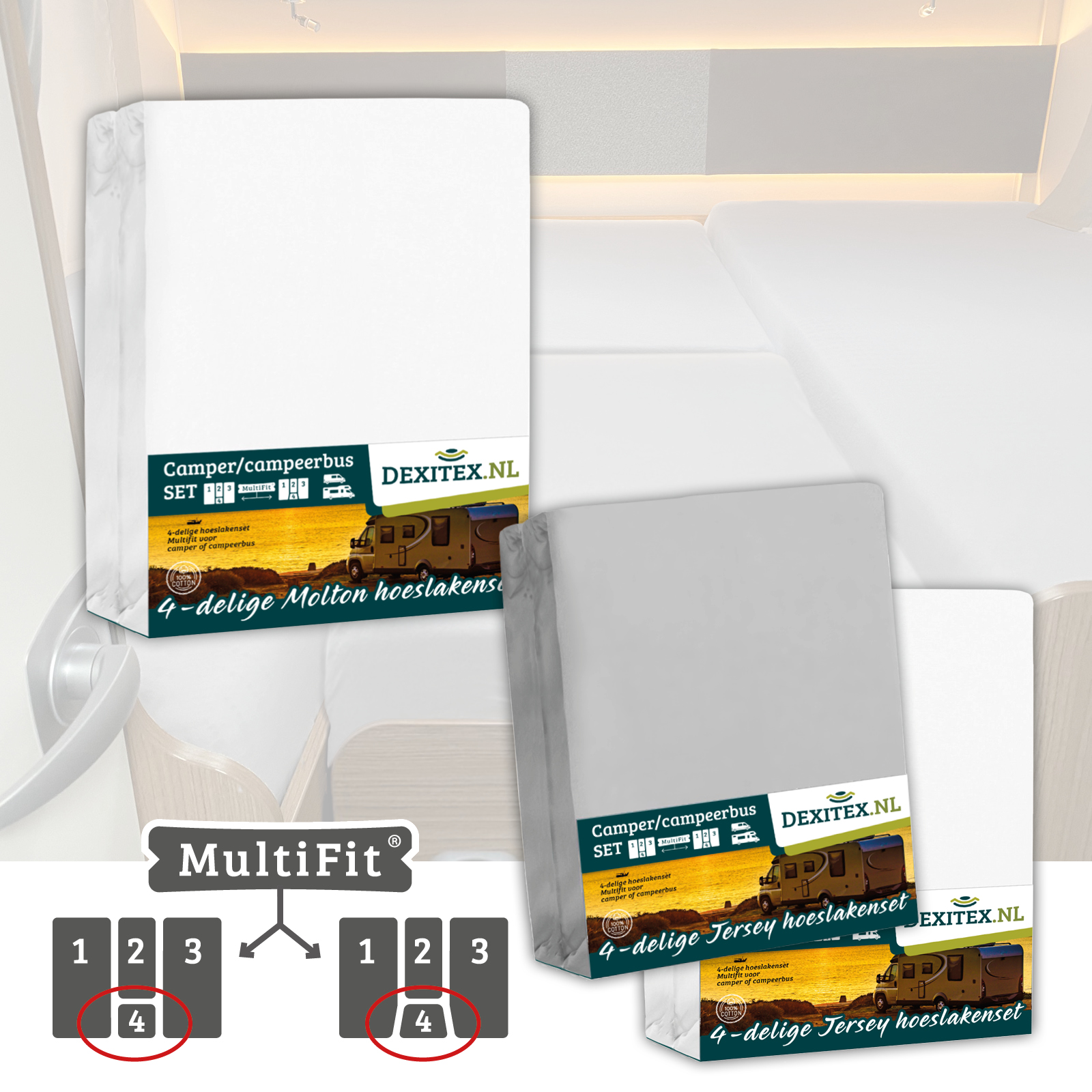 Ce set de draps-housses est spécialement conçu pour les matelas en 4 parties dans les camping-cars ou les caravanes. Le set contient 4 draps-housses en jersey. Un pour le matelas gauche, un pour le matelas droit et deux draps spécialement conçus pour la partie centrale. Ainsi, tous les matelas sont parfaitement et proprement installés.