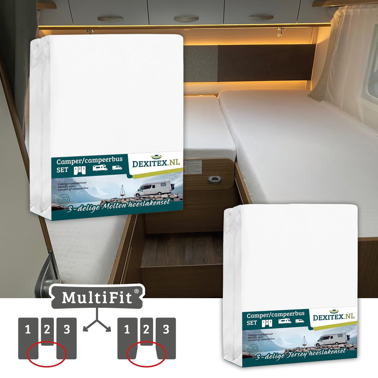 Ensemble de draps-housses 3 pièces avec ensemble de draps-housses 3 pièces (spécialement pour le camping-car/la caravane).MultiFit®.