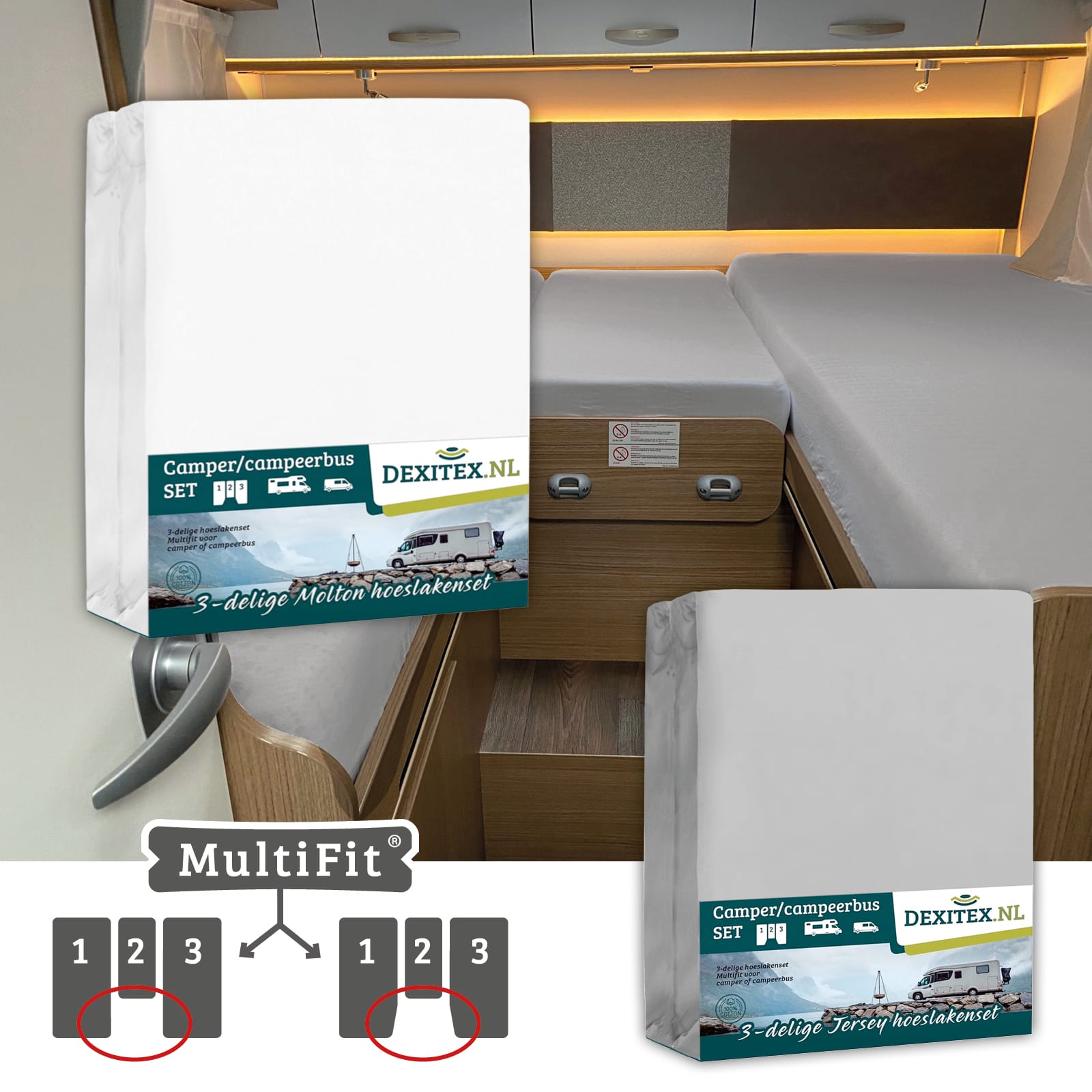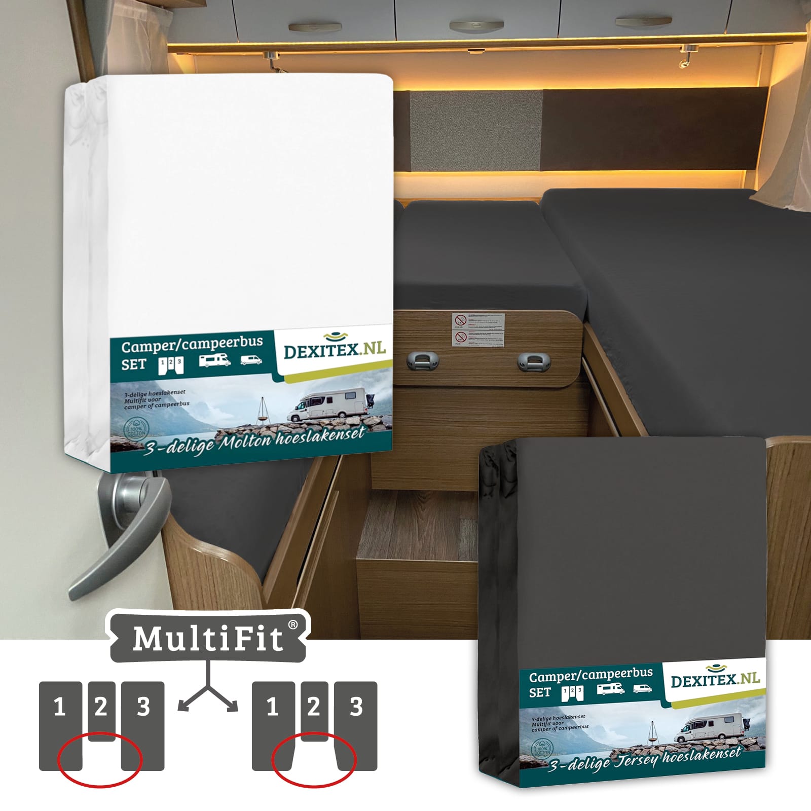Ce set de draps-housses est spécialement conçu pour les matelas en 3 parties dans les camping-cars et les caravanes. Le set contient 3 draps-housses en jersey. Un pour le matelas gauche, un pour le matelas droit et un spécialement conçu pour la partie centrale. Ainsi, les 3 matelas sont parfaitement et proprement installés.