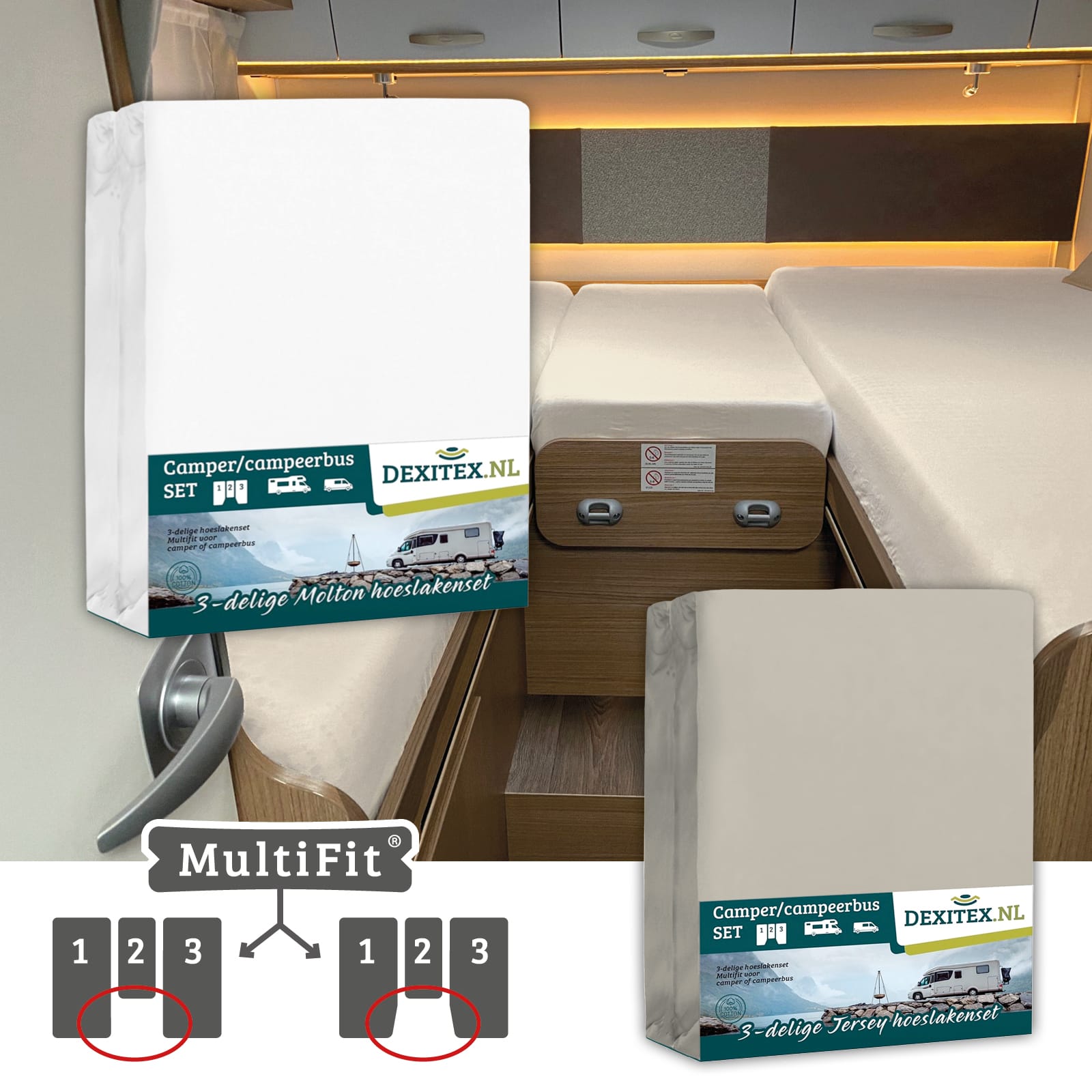 Ensemble complet de 3 pièces de draps-housses spécialement conçu pour l’aménagement des caravanes et des camping-cars.