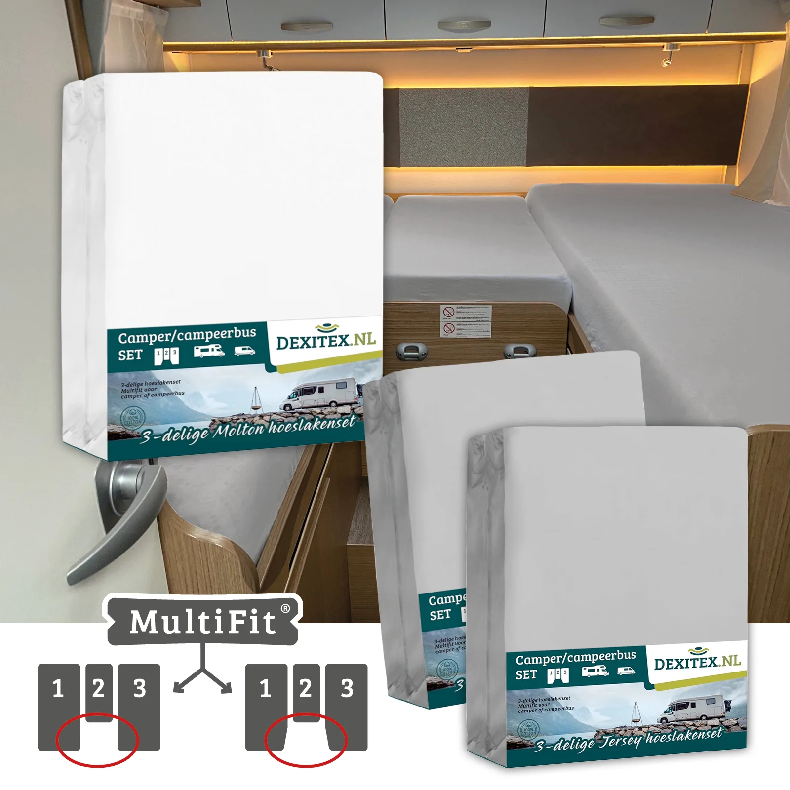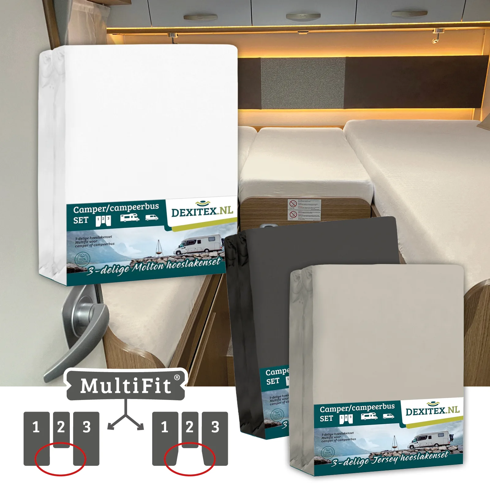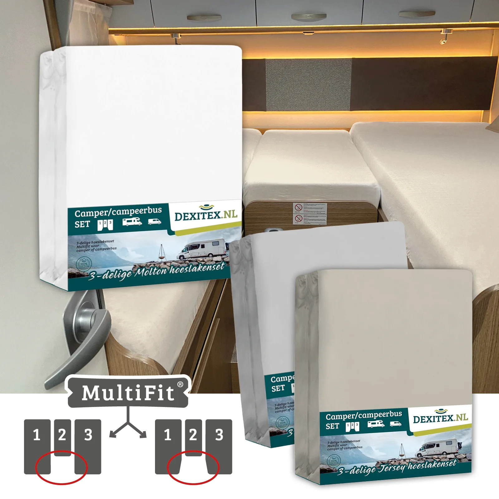 Ensemble complet de draps-housses en molleton et en jersey (ensembles de 3 pièces spécialement conçus pour l’aménagement des caravanes et des camping-cars)MultiFit®.