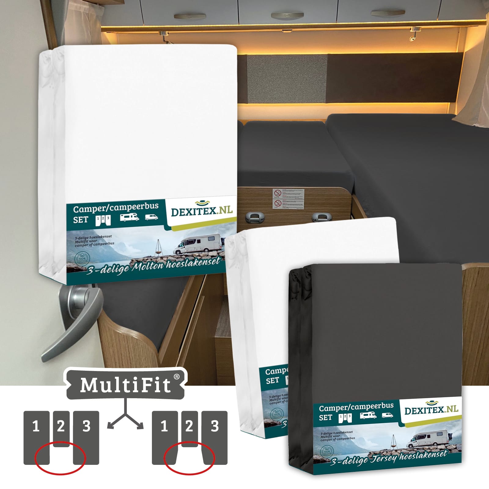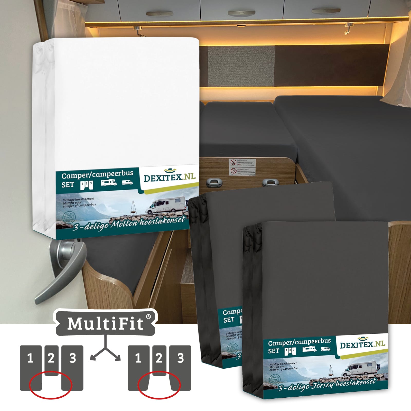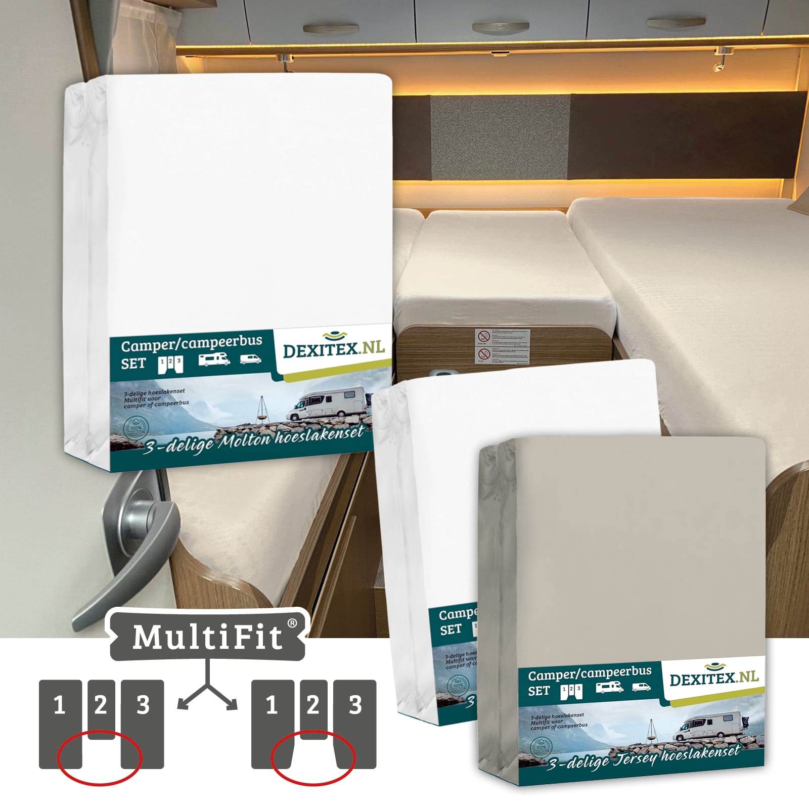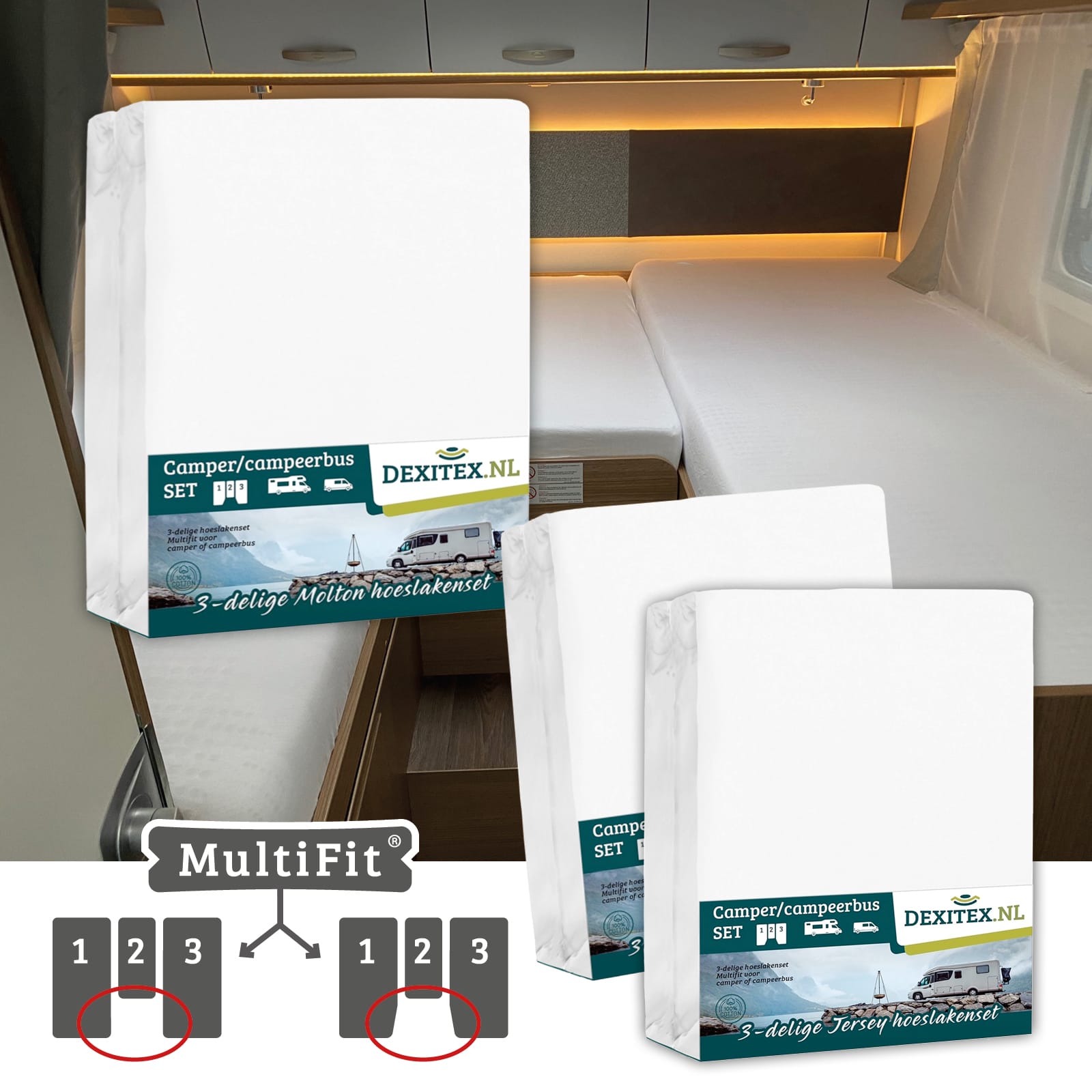 Ensemble complet de draps-housses en molleton et en jersey (ensembles de 3 pièces spécialement conçus pour l’aménagement des caravanes et des camping-cars)MultiFit®.