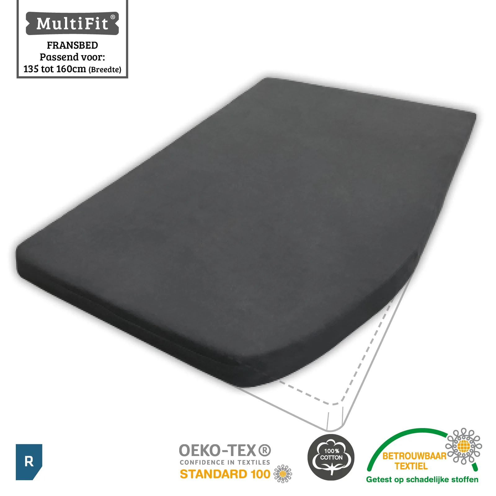 En termes de dimensions, nous avons développé ces draps-housses avec un ajustement MultiFit®, ce qui signifie que ces draps-housses/moltons sont fabriqués avec 3 coins différents de sorte qu’ils peuvent être utilisés parfaitement pour les matelas queen bed/top matelas d’une largeur de 130 à 160 cm, la longueur est d’environ 200 cm. Très flexible !